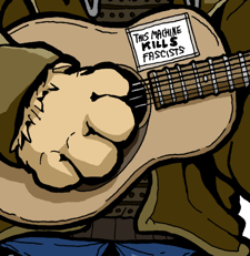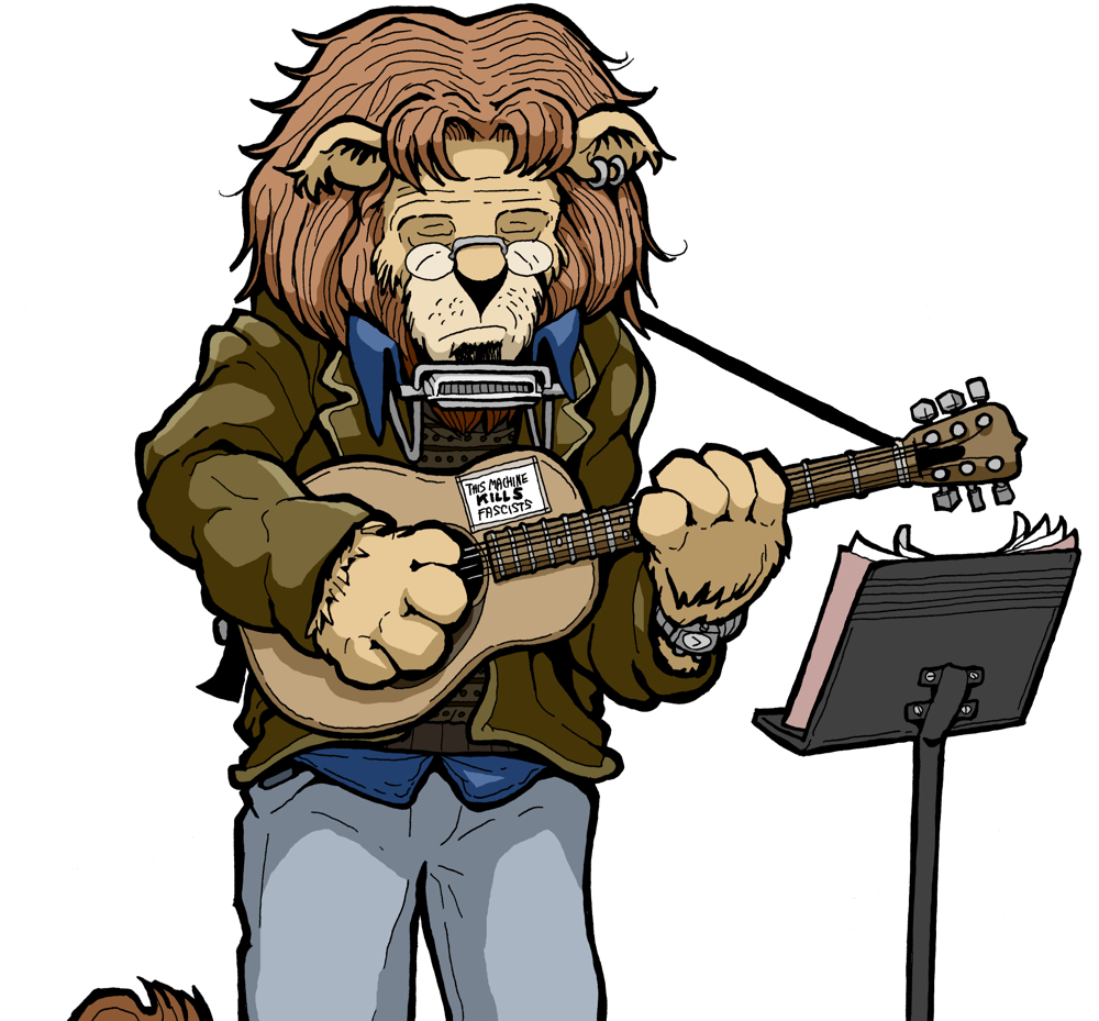 But now he was having second thoughts. The sign on his guitar that read, like Woody Guthrie had, "THIS MACHINE KILLS FASCISTS," had been half covered up with a less politically-charged note: "THIS MACHINE MAXIMIZES UTILITY." His attempt to make the guitar sign less politically charged (why is it politically charged to mention fascism, when all polite company agrees: Fascism is bad news?) now looked like a corny joke. 'Laugh at Woody Guthrie, everybody!' it seemed to say. The Lion cringed inside. "It's all coming together," he said out loud. "It all makes sense."
